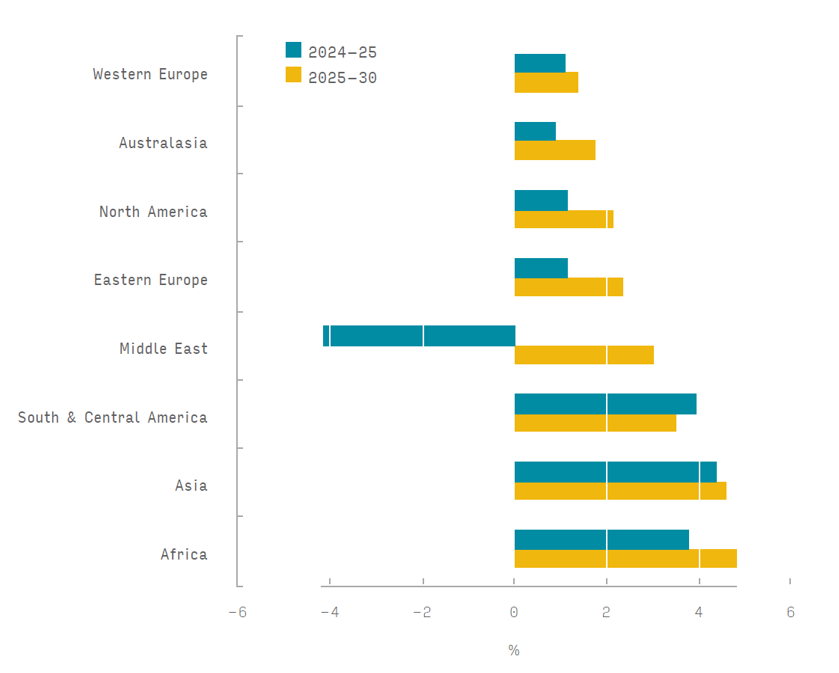 Figure 1: Anticipated growth in consumption volume for folding cartons by region, 2024–25 and 2025–30, annual % change.